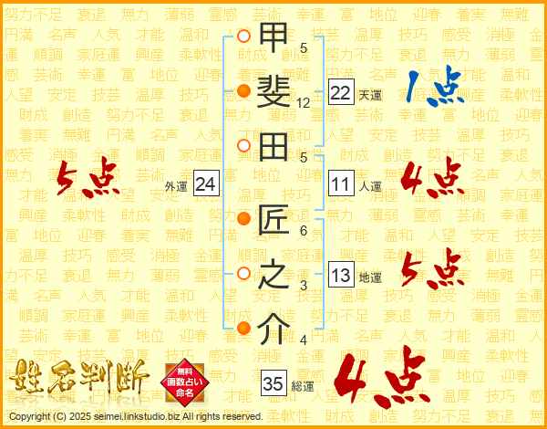 甲(5画)斐(12画)田(5画) 匠(6画)之(3画)介(4画)