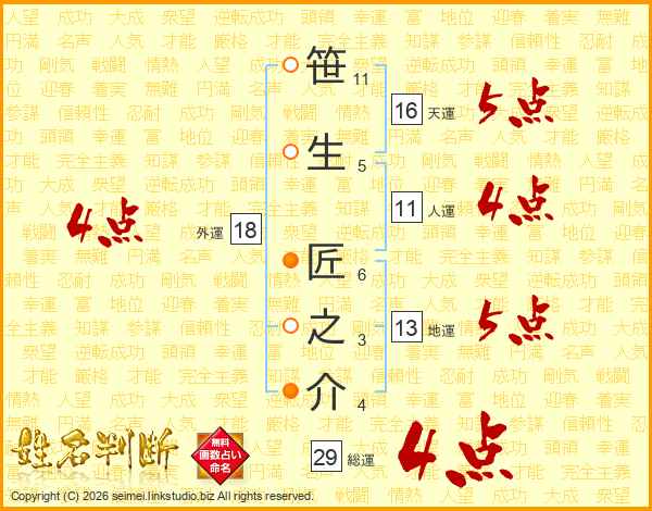笹生匠之介さんの総運は29画の4点!