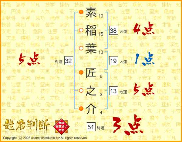 素(10画)稲(15画)葉(13画) 匠(6画)之(3画)介(4画)