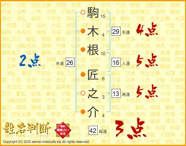 駒(15画)木(4画)根(10画) 匠(6画)之(3画)介(4画)