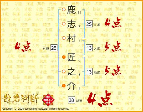 鹿(11画)志(7画)村(7画) 匠(6画)之(3画)介(4画)