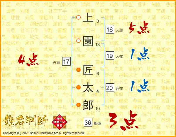 上(3画)園(13画) 匠(6画)太(4画)郎(10画)