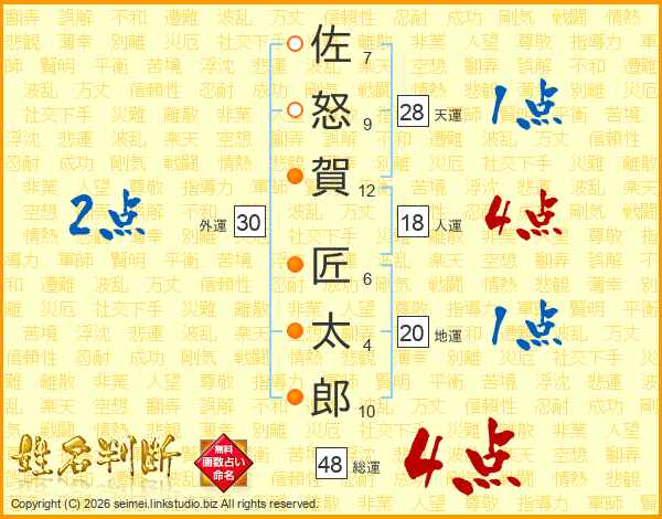 佐(7画)怒(9画)賀(12画) 匠(6画)太(4画)郎(10画)