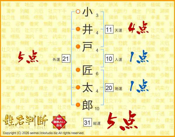 小(3画)井(4画)戸(4画) 匠(6画)太(4画)郎(10画)