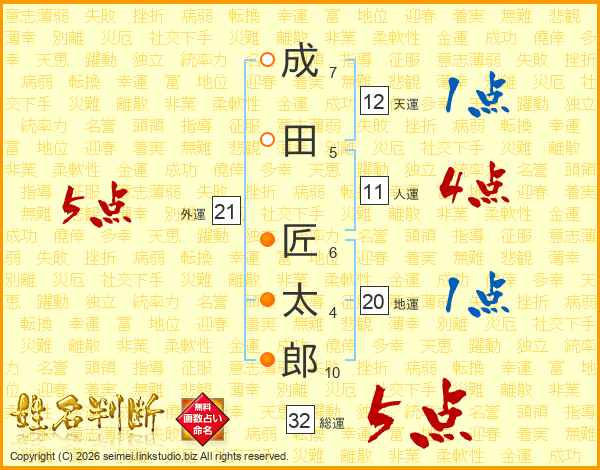 成田匠太郎さんの総運は32画の5点!