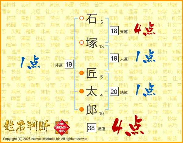 石(5画)塚(13画) 匠(6画)太(4画)郎(10画)