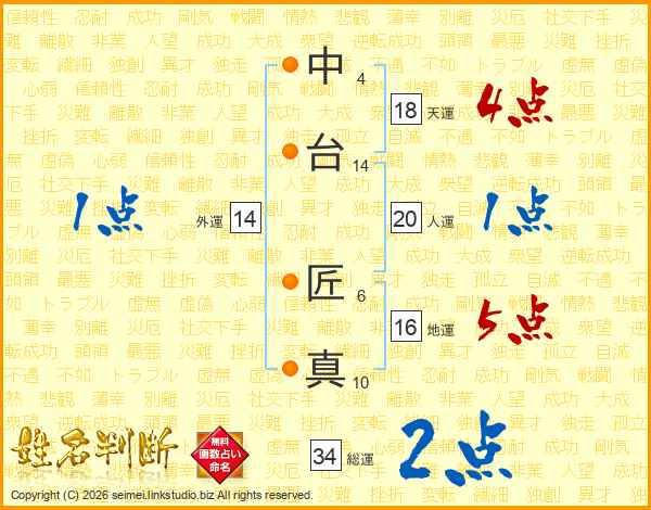 生活面を象徴する運勢です。外部から受ける影響力を表し、結婚運、家庭運や職場、環境への順応性を表します。総運から人運を引いた画数。姓や名が1文字の場合を除く。