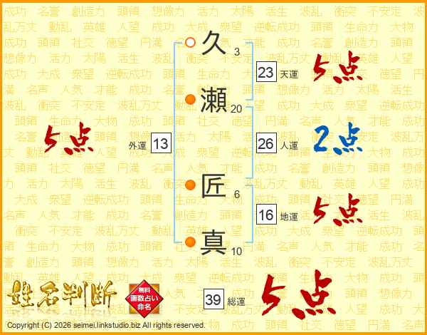 久(3画)瀬(20画) 匠(6画)真(10画)