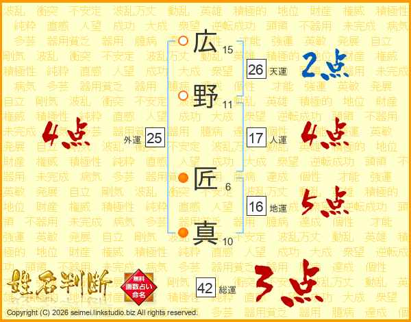 あなたの人生を表す1番重要な運勢です。生涯を通じて影響する総合運となり、主に50歳以降の晩年期に影響を及ぼします。苗字と名前の合計画数。
