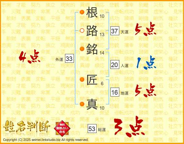 根(10画)路(13画)銘(14画) 匠(6画)真(10画)