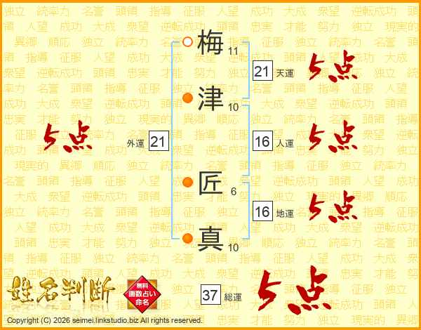 梅津匠真さんの天運は21画の5点!