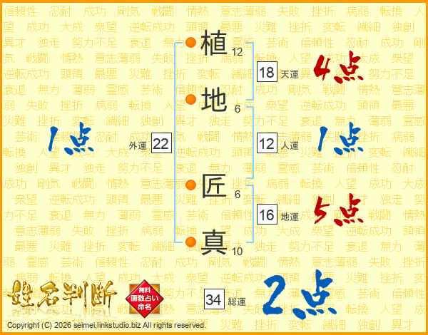 生活面を象徴する運勢です。外部から受ける影響力を表し、結婚運、家庭運や職場、環境への順応性を表します。総運から人運を引いた画数。姓や名が1文字の場合を除く。
