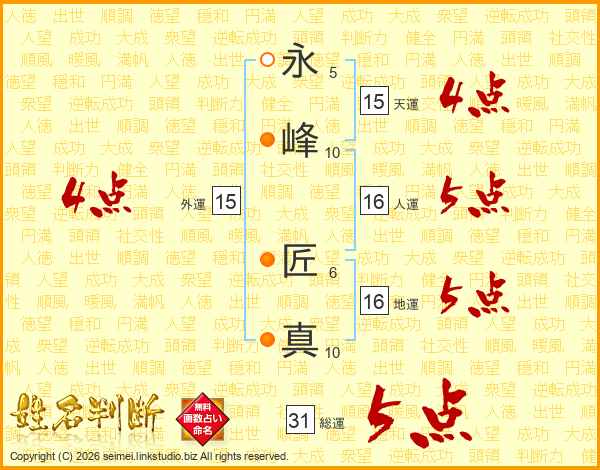 永峰匠真さんの総運は31画の5点!