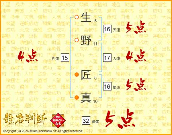 生活面を象徴する運勢です。外部から受ける影響力を表し、結婚運、家庭運や職場、環境への順応性を表します。総運から人運を引いた画数。姓や名が1文字の場合を除く。