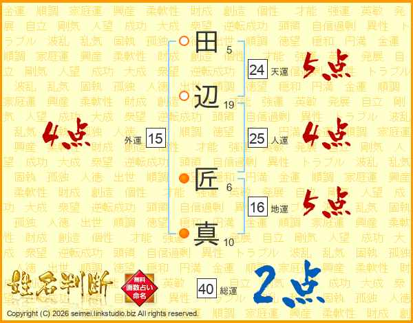 田(5画)辺(19画) 匠(6画)真(10画)