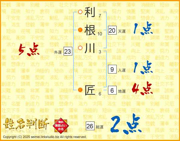 生活面を象徴する運勢です。外部から受ける影響力を表し、結婚運、家庭運や職場、環境への順応性を表します。総運から人運を引いた画数。姓や名が1文字の場合を除く。