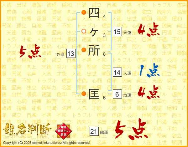 生活面を象徴する運勢です。外部から受ける影響力を表し、結婚運、家庭運や職場、環境への順応性を表します。総運から人運を引いた画数。姓や名が1文字の場合を除く。