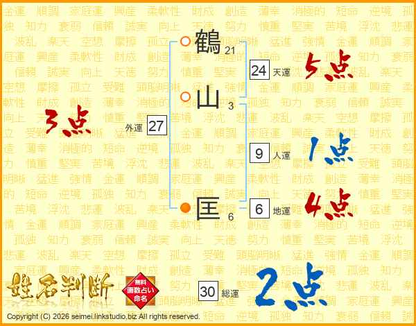 生活面を象徴する運勢です。外部から受ける影響力を表し、結婚運、家庭運や職場、環境への順応性を表します。総運から人運を引いた画数。姓や名が1文字の場合を除く。