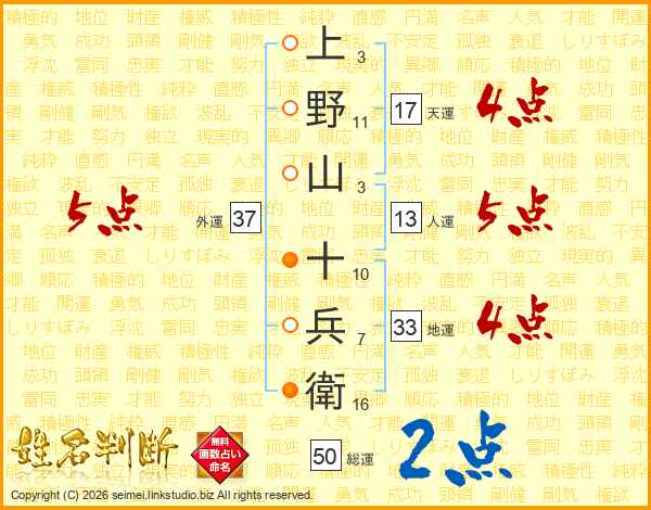 上(3画)野(11画)山(3画) 十(10画)兵(7画)衛(16画)