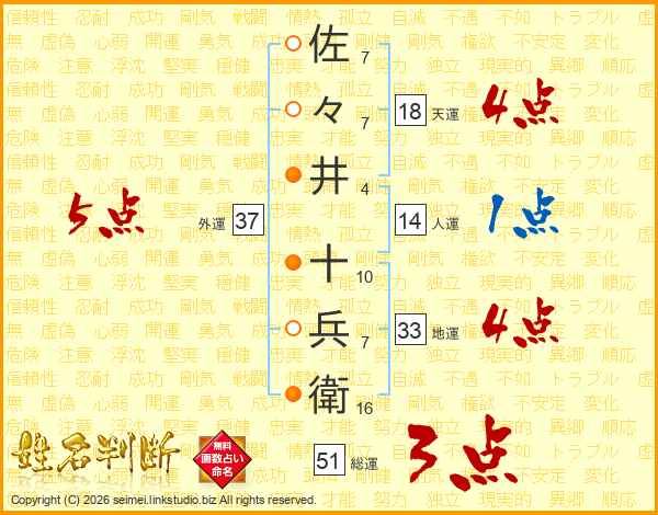 佐々井十兵衛さんの外運は37画の5点!
