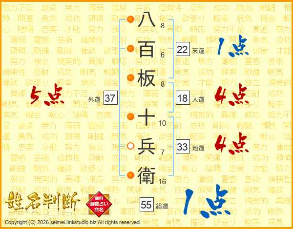 八(8画)百(6画)板(8画) 十(10画)兵(7画)衛(16画)