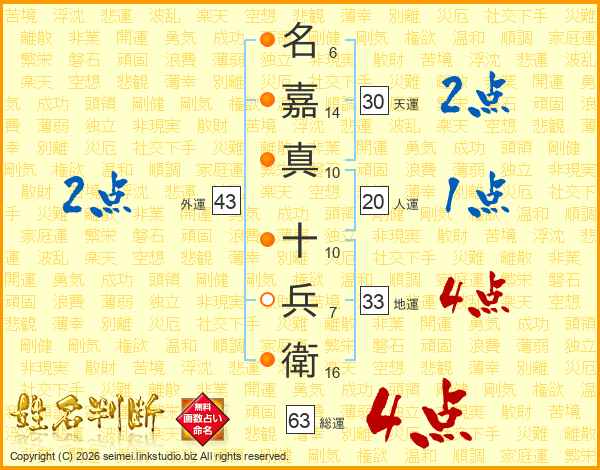 名(6画)嘉(14画)真(10画) 十(10画)兵(7画)衛(16画)