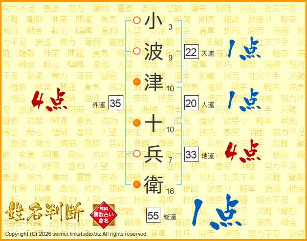 小(3画)波(9画)津(10画) 十(10画)兵(7画)衛(16画)