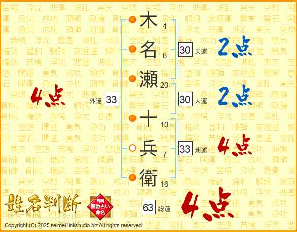 木(4画)名(6画)瀬(20画) 十(10画)兵(7画)衛(16画)