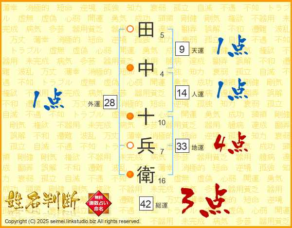田(5画)中(4画) 十(10画)兵(7画)衛(16画)