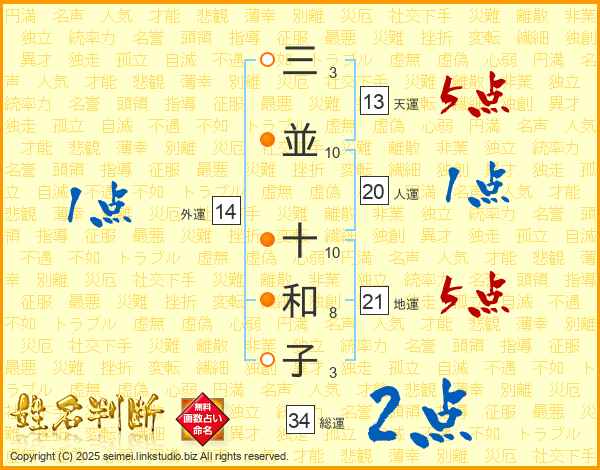 生活面を象徴する運勢です。外部から受ける影響力を表し、結婚運、家庭運や職場、環境への順応性を表します。総運から人運を引いた画数。姓や名が1文字の場合を除く。