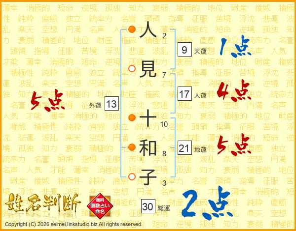 人(2画)見(7画) 十(10画)和(8画)子(3画)