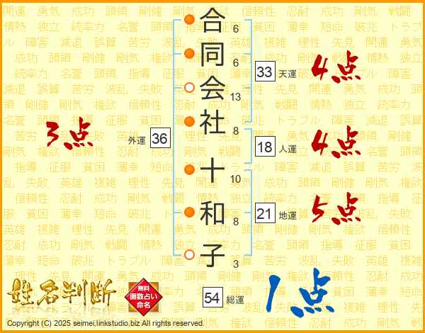 生活面を象徴する運勢です。外部から受ける影響力を表し、結婚運、家庭運や職場、環境への順応性を表します。総運から人運を引いた画数。姓や名が1文字の場合を除く。