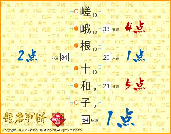 嵯(13画)峨(10画)根(10画) 十(10画)和(8画)子(3画)