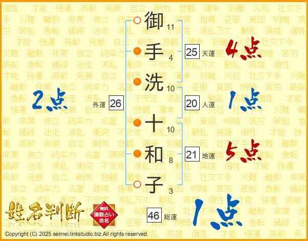 生活面を象徴する運勢です。外部から受ける影響力を表し、結婚運、家庭運や職場、環境への順応性を表します。総運から人運を引いた画数。姓や名が1文字の場合を除く。