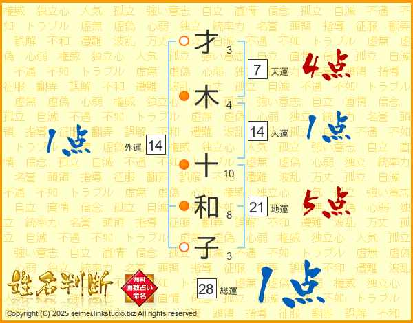 生活面を象徴する運勢です。外部から受ける影響力を表し、結婚運、家庭運や職場、環境への順応性を表します。総運から人運を引いた画数。姓や名が1文字の場合を除く。