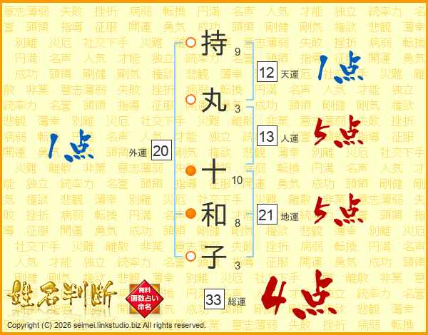 生活面を象徴する運勢です。外部から受ける影響力を表し、結婚運、家庭運や職場、環境への順応性を表します。総運から人運を引いた画数。姓や名が1文字の場合を除く。