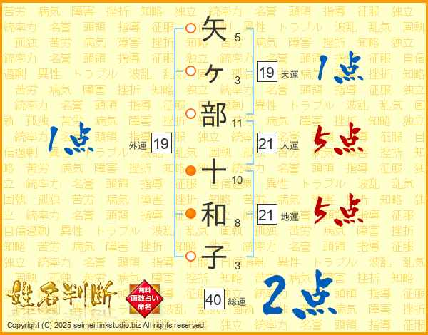 生活面を象徴する運勢です。外部から受ける影響力を表し、結婚運、家庭運や職場、環境への順応性を表します。総運から人運を引いた画数。姓や名が1文字の場合を除く。