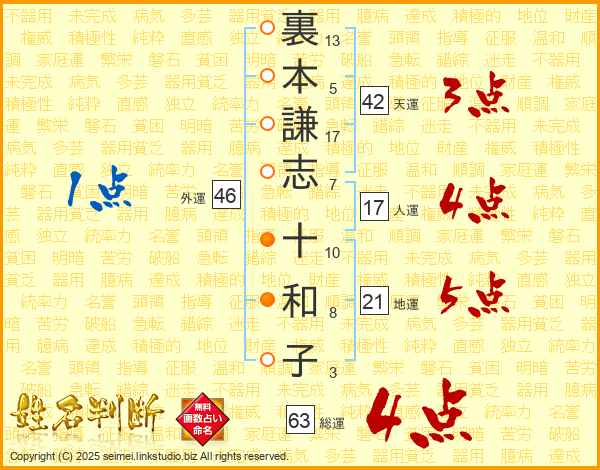 裏(13画)本(5画)謙(17画)志(7画) 十(10画)和(8画)子(3画)