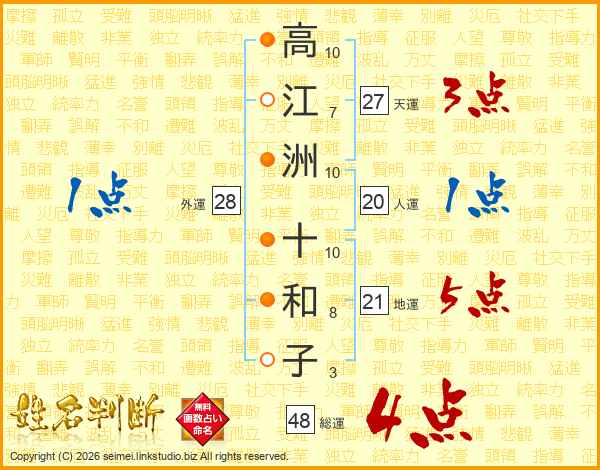 高(10画)江(7画)洲(10画) 十(10画)和(8画)子(3画)