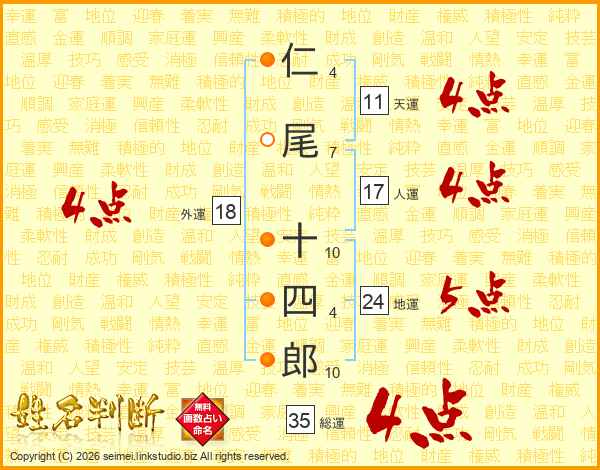 仁(4画)尾(7画) 十(10画)四(4画)郎(10画)