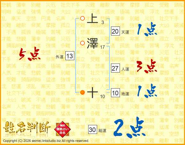 生活面を象徴する運勢です。外部から受ける影響力を表し、結婚運、家庭運や職場、環境への順応性を表します。総運から人運を引いた画数。姓や名が1文字の場合を除く。
