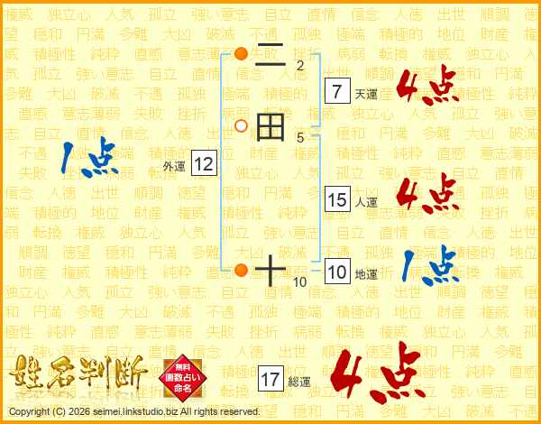 生活面を象徴する運勢です。外部から受ける影響力を表し、結婚運、家庭運や職場、環境への順応性を表します。総運から人運を引いた画数。姓や名が1文字の場合を除く。
