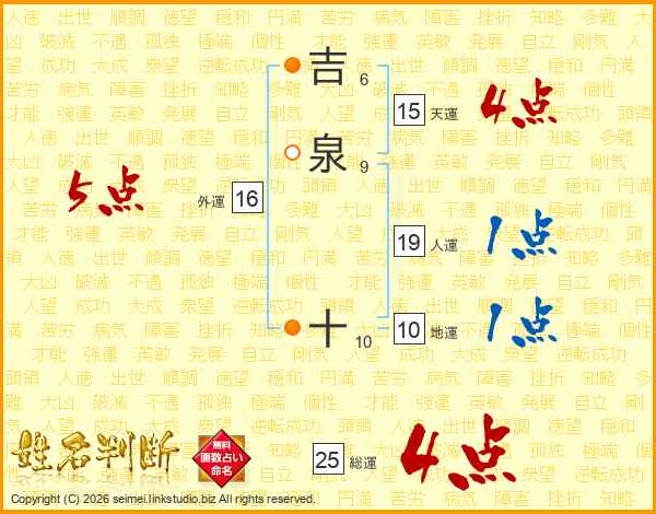 生活面を象徴する運勢です。外部から受ける影響力を表し、結婚運、家庭運や職場、環境への順応性を表します。総運から人運を引いた画数。姓や名が1文字の場合を除く。