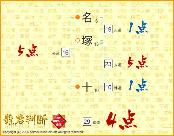 あなたの人生を表す1番重要な運勢です。生涯を通じて影響する総合運となり、主に50歳以降の晩年期に影響を及ぼします。苗字と名前の合計画数。