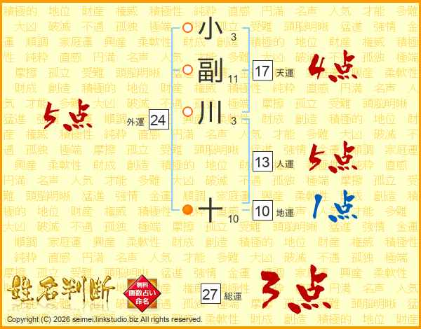 小副川十さんの総運は27画の3点!