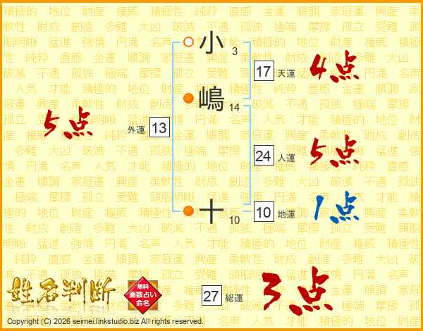 生活面を象徴する運勢です。外部から受ける影響力を表し、結婚運、家庭運や職場、環境への順応性を表します。総運から人運を引いた画数。姓や名が1文字の場合を除く。