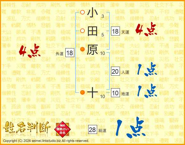 生活面を象徴する運勢です。外部から受ける影響力を表し、結婚運、家庭運や職場、環境への順応性を表します。総運から人運を引いた画数。姓や名が1文字の場合を除く。