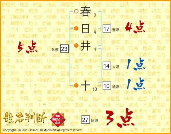 生活面を象徴する運勢です。外部から受ける影響力を表し、結婚運、家庭運や職場、環境への順応性を表します。総運から人運を引いた画数。姓や名が1文字の場合を除く。