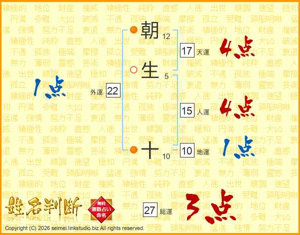 生活面を象徴する運勢です。外部から受ける影響力を表し、結婚運、家庭運や職場、環境への順応性を表します。総運から人運を引いた画数。姓や名が1文字の場合を除く。