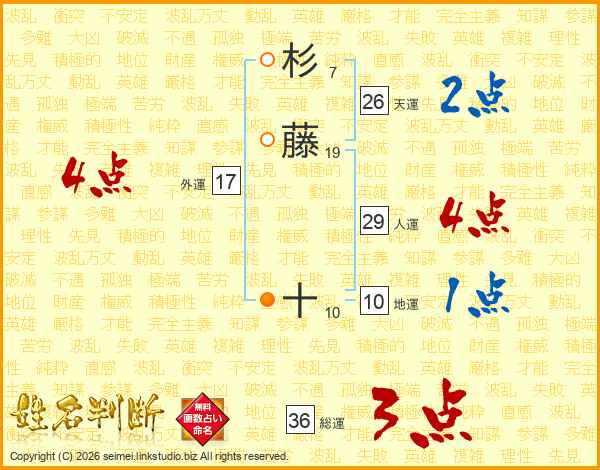 あなたの人生を表す1番重要な運勢です。生涯を通じて影響する総合運となり、主に50歳以降の晩年期に影響を及ぼします。苗字と名前の合計画数。